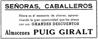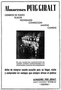 Puig Giralt es va fer famosa a Girona per la seva intensa campanya publicitària de premsa i ràdio, muntada amb criteris molt renovadors i avançats. Van començar a vendre peces de roba a metres i camises fetes a mida per Anna Motas. De mica en mica van anar incrementant la venda d’articles de confecció i reduint la venda de peces. Va ser la segona botiga de Girona a vendre peces de roba de confecció ja fabricada. L’any 1950 la botiga va fer ampliacions obrint una sala a la primera planta, i el 1960 es va inaugurar una segona planta. Durant aquesta època l’establiment ja tenia roba per a home, dona i nens, teixits de peça i roba per a la llar.